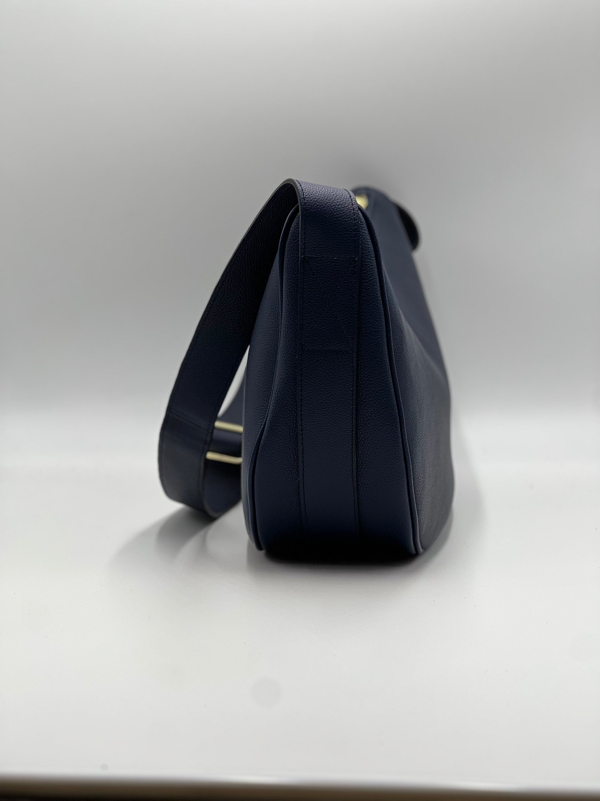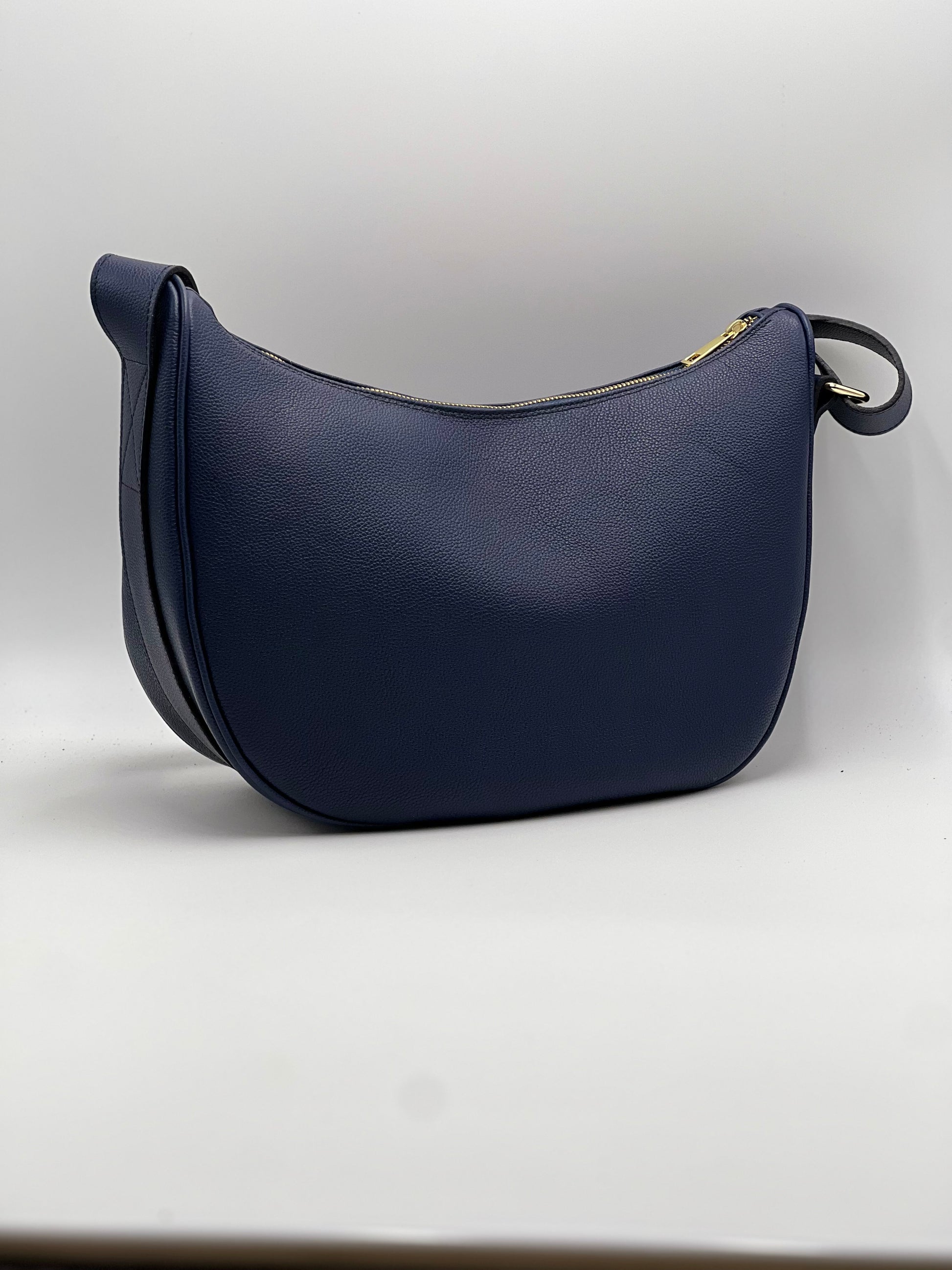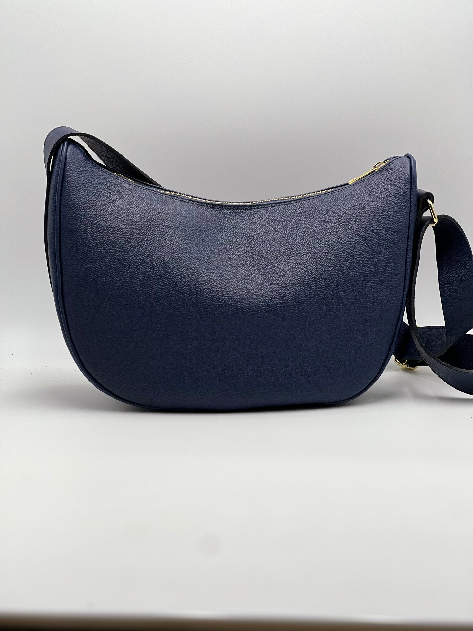 La Mezza Luna in Vitello Blu Navy è un accessorio che unisce raffinatezza e praticità in un design dal carattere contemporaneo. Realizzata in pregiata pelle di vitello, presenta una superficie liscia e sofisticata, valorizzata dal profondo colore blu navy, elegante e versatile.